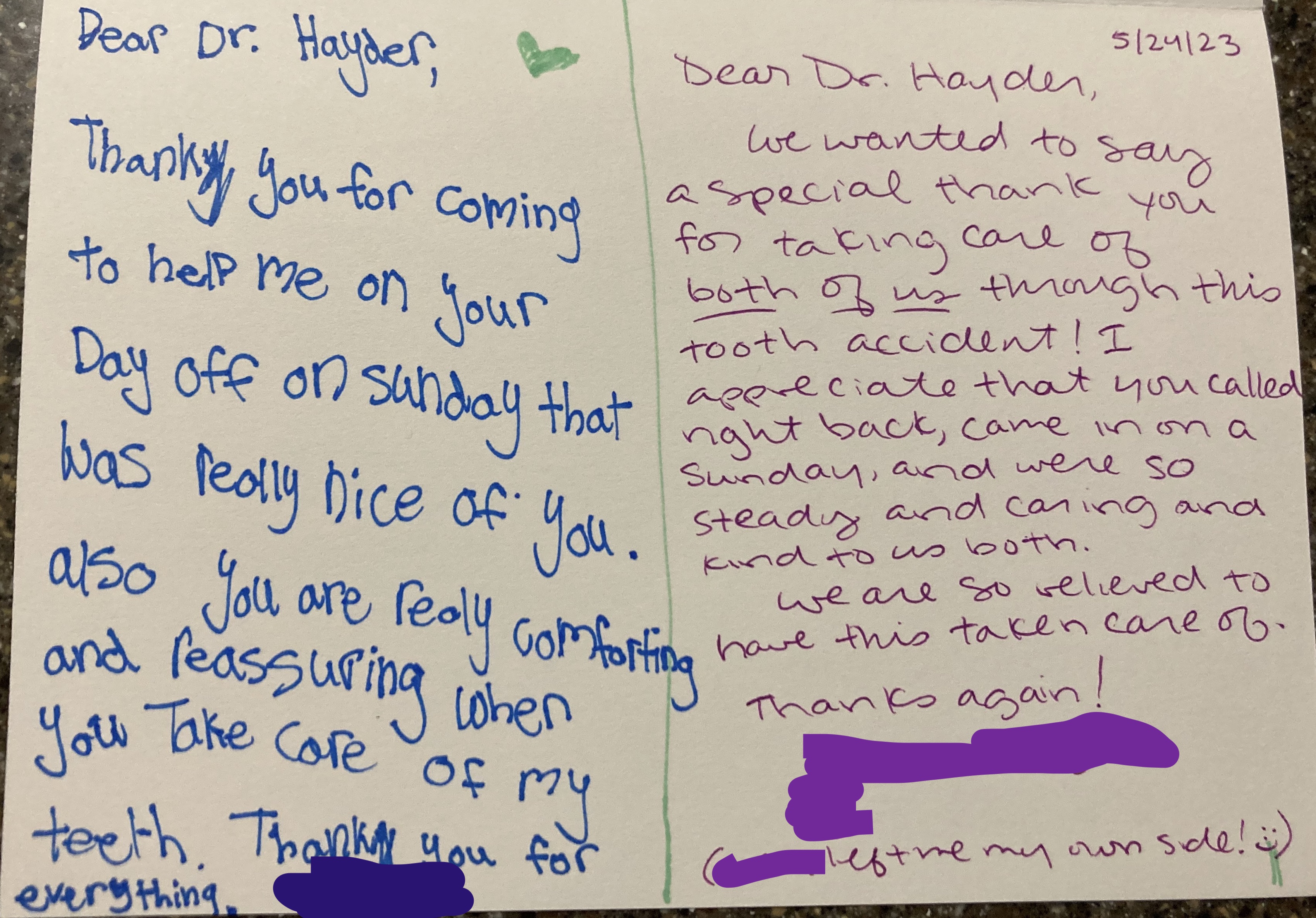 Dr. Hayder is extremely caring and professional. Our orthodontist recommended this office and we have been very impressed. Not only have we been put at ease at regular cleanings but today our son had an emergency. Dr. Hayder was able to immediately see him and quickly assessed that he needed to be treated in the emergency room to prevent the infection spreading. Given her excellent clinical skills and referral he was immediately treated appropriately with strong antibiotics and is doing great. She called us that evening to follow up and ensure that he was receiving the appropriate care and that we will have a follow up appointment with her in the next few days. We feel VERY fortunate that we are with a dentist that is able to recognize emergent health issues and refer appropriately as this could have become a very serious medical situation. We highly recommend this office and Dr. Hayder!